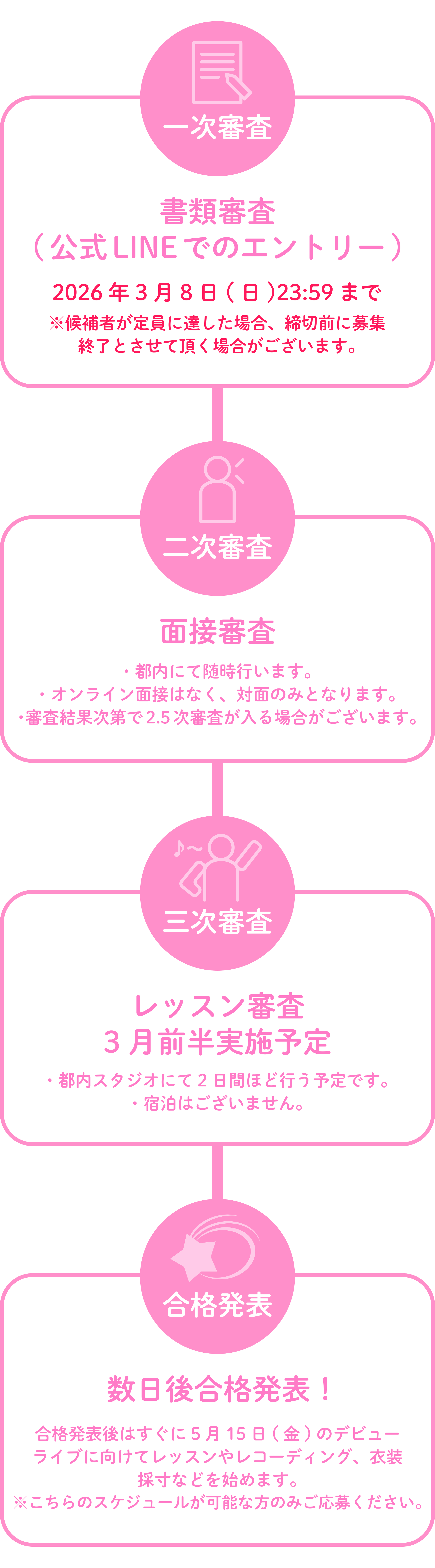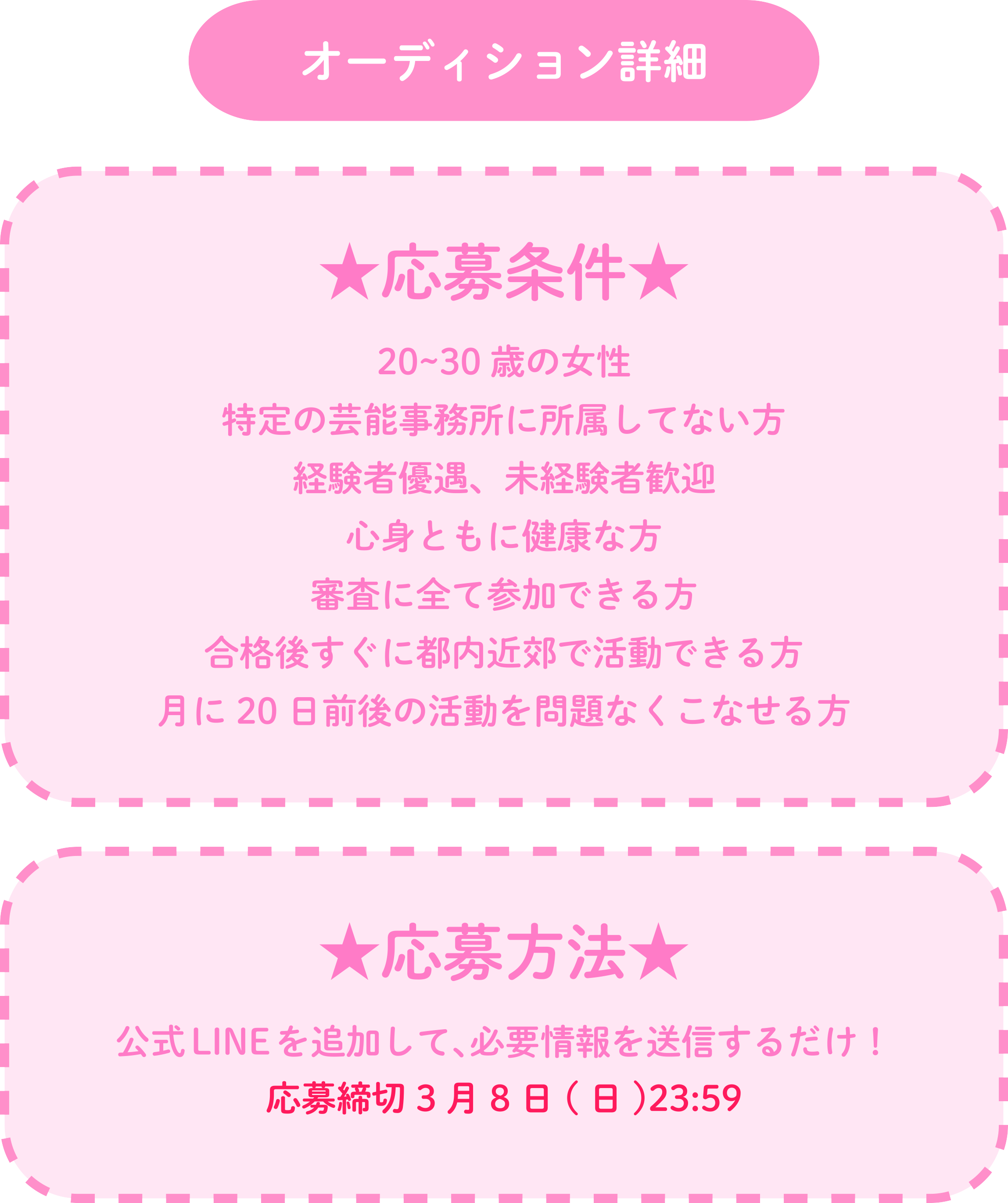 * オーディションに関するご質問・ご相談は、公式LINEまたは指定のエントリーフォームよりお問い合わせください。